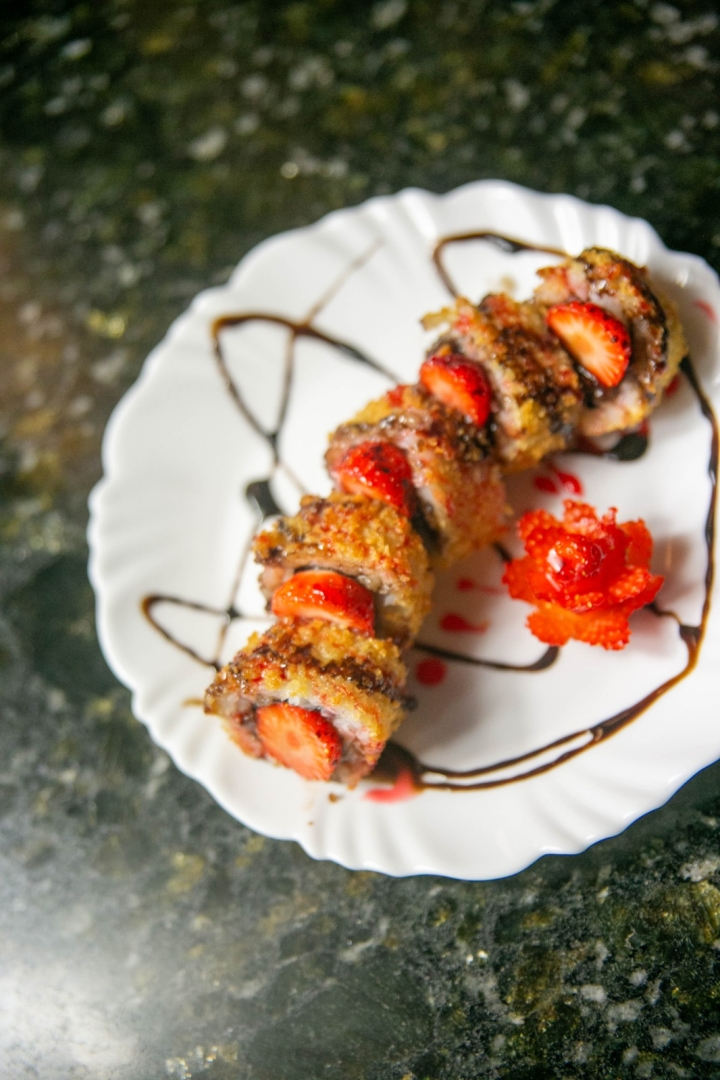 Hot roll na massa de pastel com recheio de salmão grelhado, skin, cream cheese, kani, tomate seco e molho de laranja.